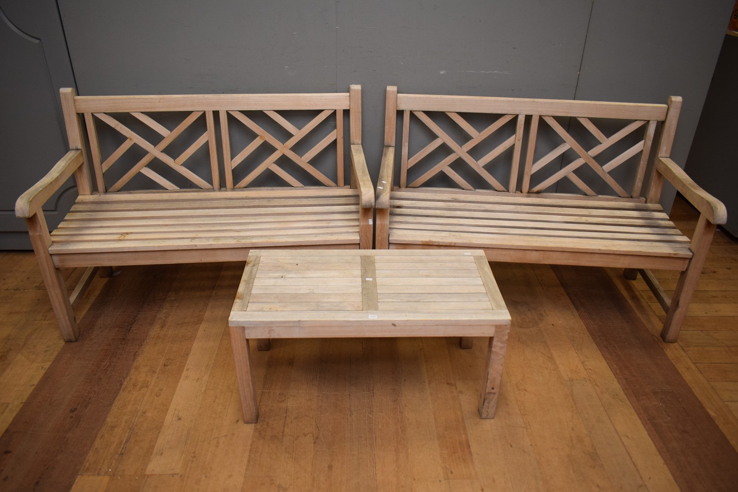 A THREE PIECE TEAK OUTDOOR SETTING (A/F) (93H x 132W x 64D CM) (PLEASE NOTE THIS HEAVY ITEM MUST BE REMOVED BY CARRIERS AT THE CUSTOMER'S EXPENSE. LEONARD JOEL STAFF CANNOT ASSIST CARRYING THIS ITEM) (X-LARGE ITEM)