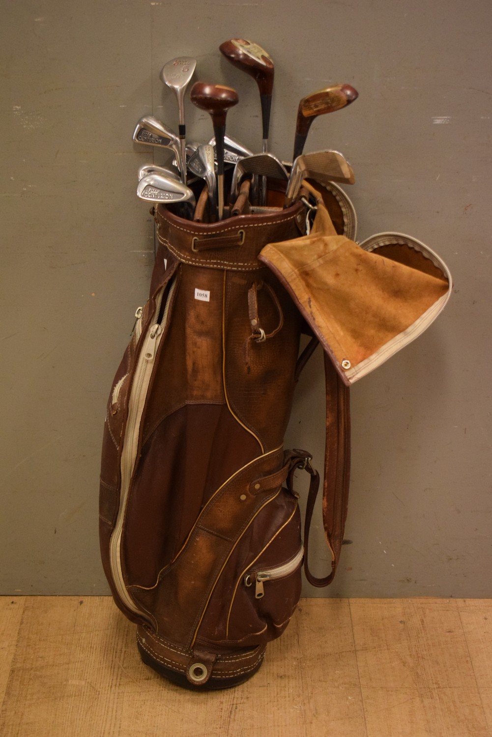 COMPLETE SET OF SPALDING ELITE CENTURION GOLF CLUBS IN BROWN LEATHER BAG WITH ACCESSORIES (A/F) (113H CM) (LEONARD JOEL DELIVERY SIZE: LARGE)