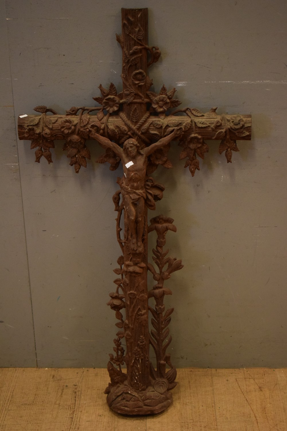 A LARGE 19TH CENTURY FRENCH CAST IRON CROSS WITH JESUS AND FOLIATE DETAIL AND DECORATION (DOUBLE SIDED) (122H X 65W CM) (PLEASE NOTE THIS HEAVY ITEM MUST BE REMOVED BY CARRIERS AT THE CUSTOMER'S EXPENSE. LEONARD JOEL STAFF CANNOT ASSIST CARRYING THIS ITEM) (X-LARGE ITEM)