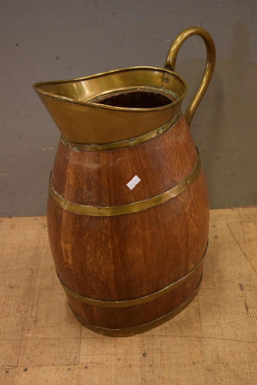 A LARGE 19TH CENTURY FRENCH COOPERED WOODEN BRASS BOUND AND MOUNTED WINE EWER (48H X 23W X 42D CM) (LEONARD JOEL DELIVERY SIZE: MEDIUM)