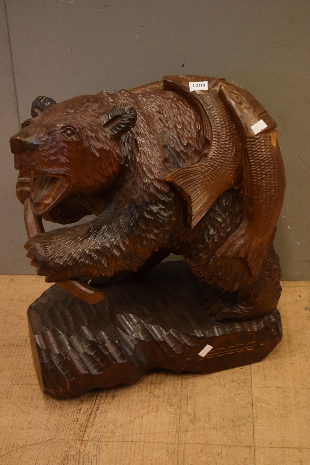 A 1940S CARVED EUROPEAN BEAR WITH SALMON ACROSS BACK (46H X 40W CM)