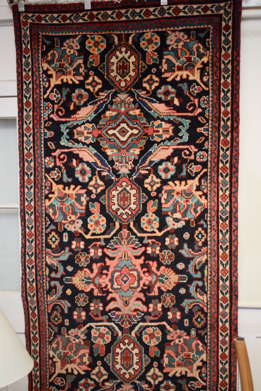 A RARE PERSIAN MAHALLAT HALL RUNNER, 100% WOOL. CIRCA 1960'S. HAND-KNOTTED VILLAGE WEAVE FROM THE ARAK REGION WITH RARE DESIGN OF TRIPLE STYLIZED MEDALLIONS SET AGAINST BOLD FANNING PALMETTES & FLORAL MOTIFS IN NAVY FIELD. BORDER OF FLOWER HEADS & TENDRILS. THE ENTIRE IN VIBRANT COLOURS. CERTIFCATE OF AUTHENTICITY INCLUDED. SIZE: 314X116CM ORIGIN: PERSIA - RRP: $3300