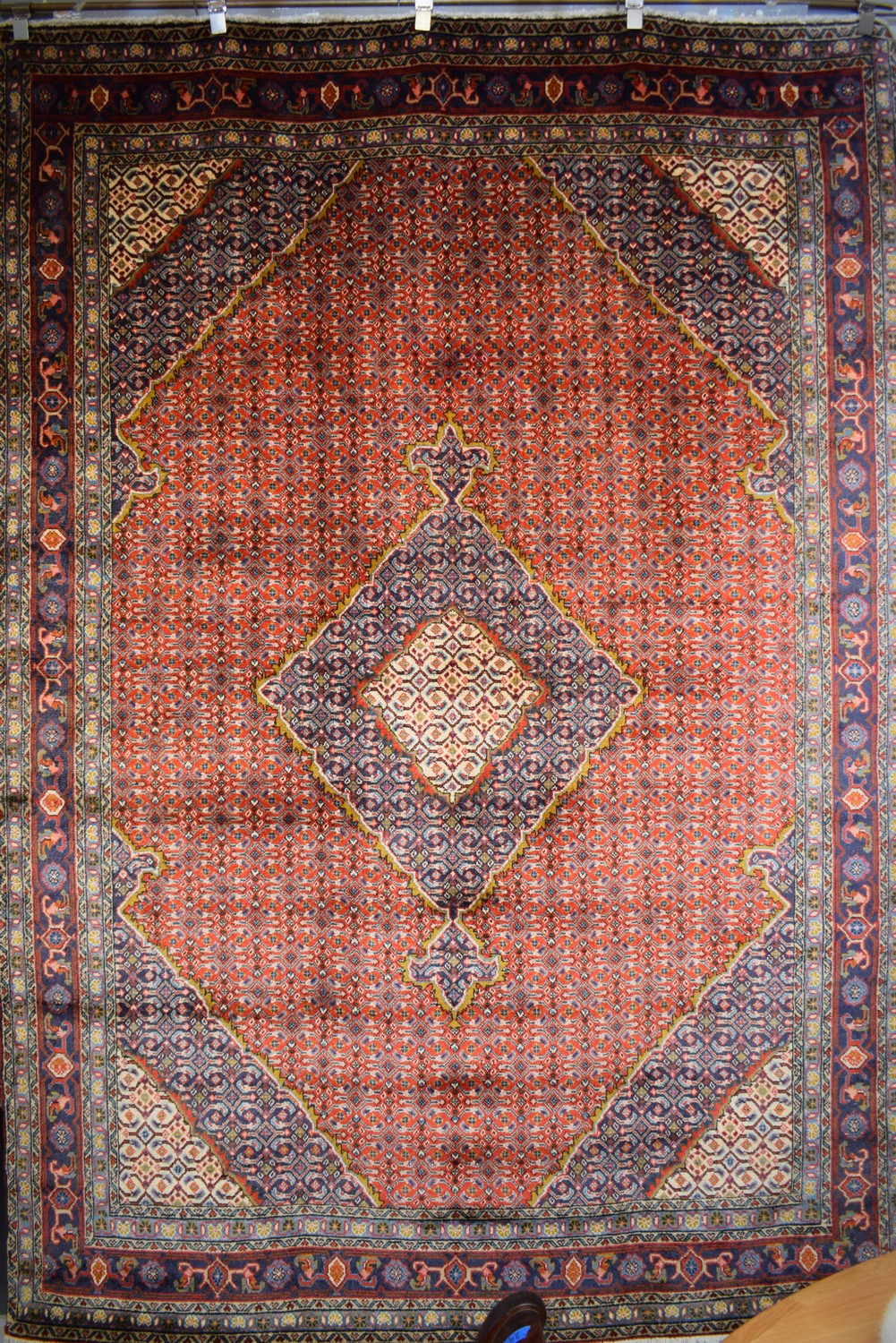 A FINE PERSIAN ARDEBIL CARPET, HAND-KNOTTED. IN EXCELLENT CONDITION. 100% WOOL. TRADITIONAL DESIGN OF A BEAUTIFUL ELONGATED MEDALLION AND CORNER MEDALLIONS IN A CREAM FIELD OF HERATI MAHI MOTIFS. ALL OVER HERATI MOTIFS IN A DEEP CRIMSON. CERTIFCATE OF AUTHENTICITY INCLUDED. SIZE: 285X203CM ORIGIN: PERSIA - RRP: $3,900