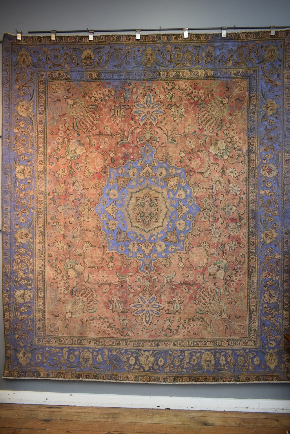 AN EXCEPTIONAL MODERN VINTAGE PERSIAN TABRIZ, VINTAGE PILE A ONE-OF-A-KIND MODERN CARPET AS SEE IN VOUGUE AND BELLE INTERIOR MAGAZINES. CREATED FROM AN AUTHENTIC VINTAGE MEDALLION DESIGN TABRIZ CARPET IN A FIELD OF LIGHT VIOLET BLUE AND HAND-CARVED EMBOSSED FLORAL PATTERNS. THE BACKGROUND HAS PEACH & TAN TONES WITH A HINT OF MINT GREEN. CERTIFCATE OF AUTHENTICITY INCLUDED. SIZE: 243X288CM. ORIGIN: PERSIA - RRP: $5,900