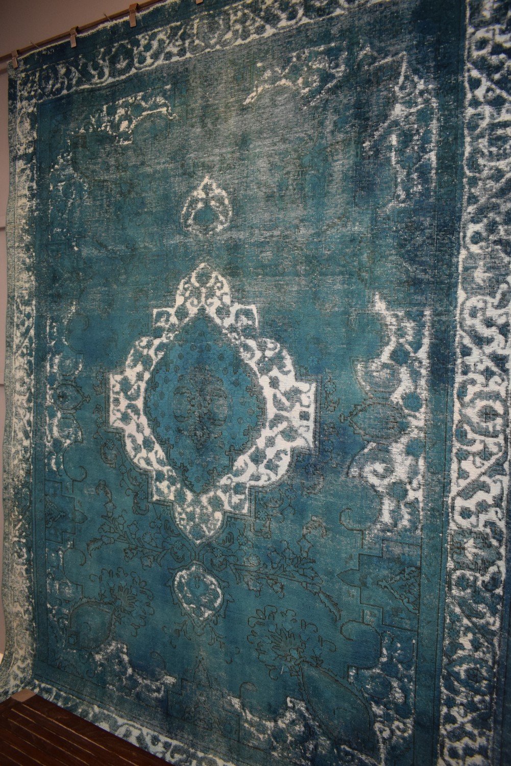 A CONTEMPORARY DECORATIVE VINTAGE OVER-DYED PERSIAN TABRIZ CARPET. VINTAGE PILE. A UNIQUE & INDIVIDUAL MODERN CARPET CREATED FROM AN AUTHENTIC FINELY HAND-KNOTTED VINTAGE PERSIAN TABRIZ CARPET WITH CLASSIC MEDALLION DESIGN. THE PILE IS SHORN AND THE ENTIRE IS OVER-DYED IN CHARCOAL-BLUE & CREAM TONES. GALLERY EXHIBITED CONDITION. SIZE: 330X247CM ORIGIN: PERSIA - RRP: $6,900