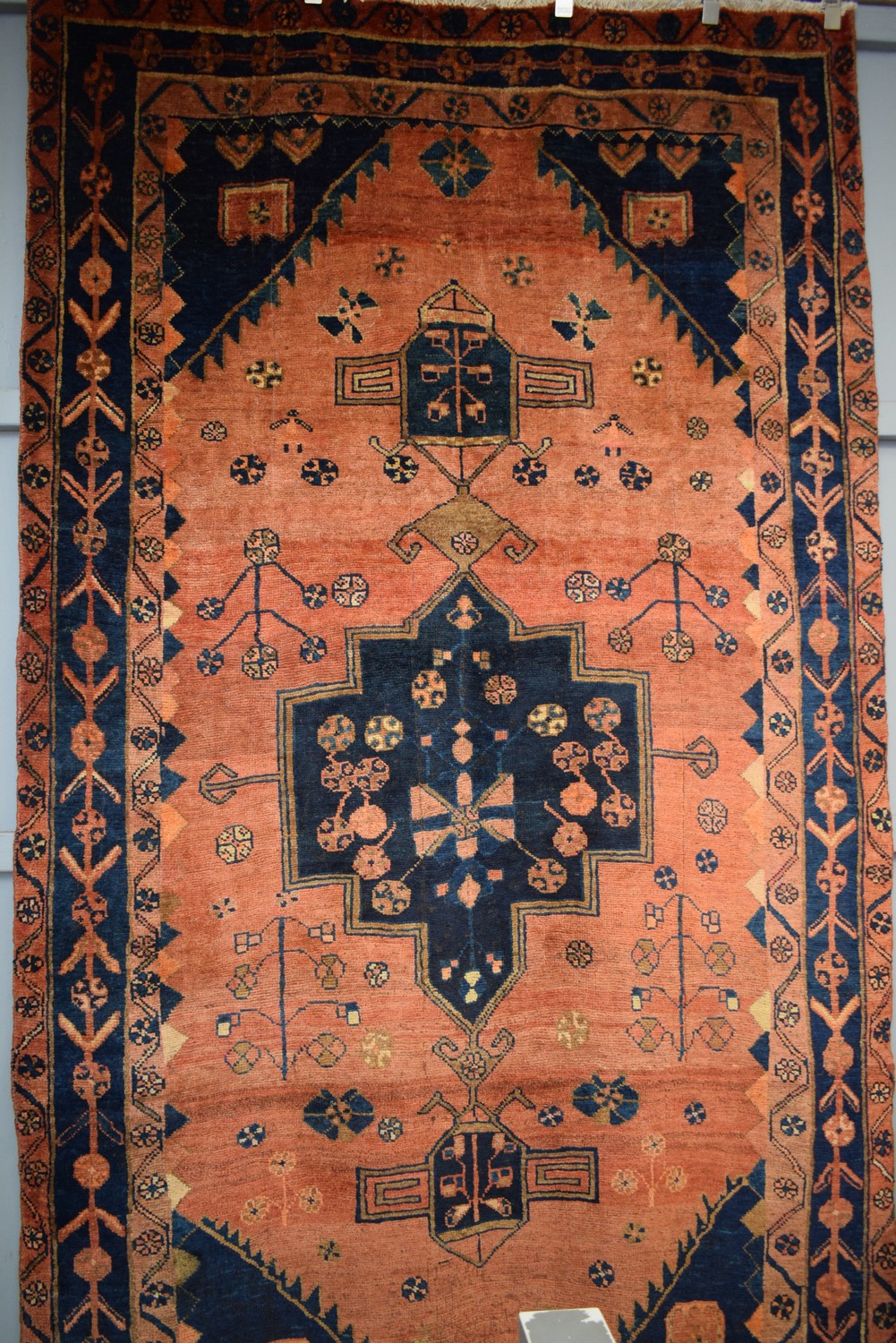 A SPLENDID PERSIAN KOHI RUG CIRCA 1970'S. 100% WOOL. NATURAL DYES WITH NATURAL ABRASH DICOLOURATION. HAND-KNOTTED TRIBAL WEAVE WITH DESIGN OF BOLD ANCHORED MEDALLION IN PRUSSION BLUE IN A FIELD OF TRIBAL PATTERNS SITTING ON A WARM TERROCOTTA BACKGROUND. BORDER OF ROSETTES AND TRIBAL MOTIFS EX-GALLERY INVENTORY. IN GOOD CONDITION. CERTIFCATE OF AUTHENTICITY INCLUDED. SIZE: 300X165CM ORIGIN: PERSIA - RRP: $3,800