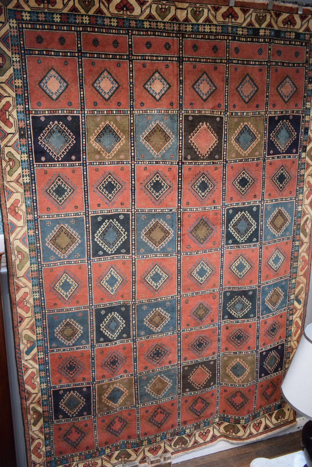 ALL OVER PATTERN OF TEKKE DESIGN. IN SOFT TONNES OF RED, CREAM, TEAL AND INK BLUE. WITH A GEOMETRIC PATTERN BORDER. EX GALLERY. CERTIFCATE OF AUTHENTICITY INCLUDED SIZE: 307X215CM ORIGIN: PERSIA - RRP: $3,200