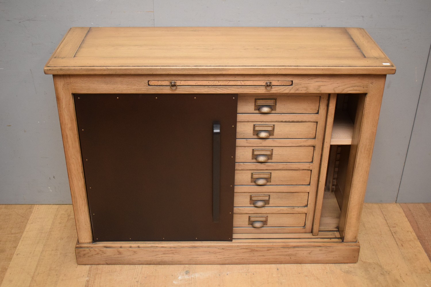AN OAK SIDEBOARD WITH SLIDING DOORS BY GAUDION FURNITURE (A/F) (86H x 115W x 41D CM) (PLEASE NOTE THIS HEAVY ITEM MUST BE REMOVED BY CARRIERS AT THE CUSTOMER'S EXPENSE. LEONARD JOEL STAFF CANNOT ASSIST CARRYING THIS ITEM) (X-LARGE ITEM)