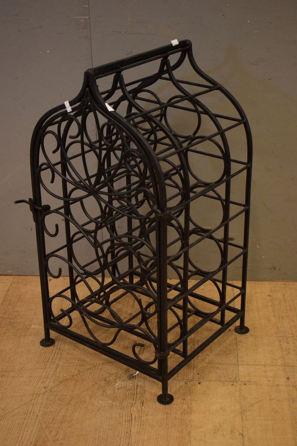A FOURTEEN BOTTLE WROUGHT IRON WINE RACK (71H X 37W X 35D CM) (LEONARD JOEL DELIVERY SIZE: MEDIUM)