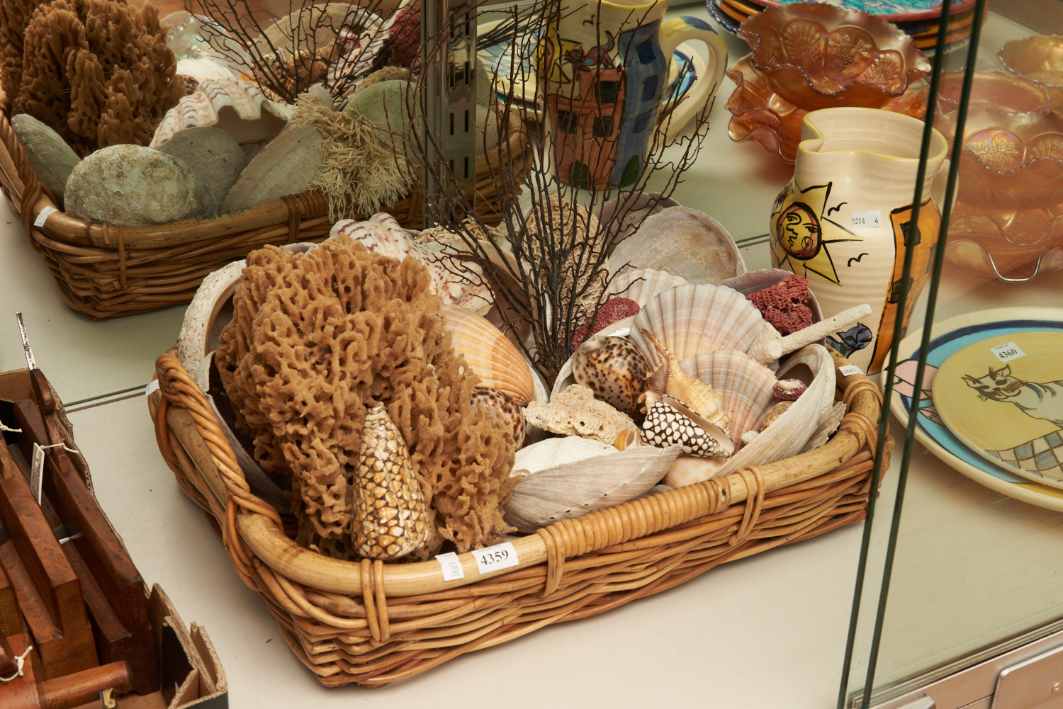 A BASKET OF OVER 50 SHELLS AND OCEAN SPECIMENS INCLUDING CLAMS, SEA SPONGE, RED CORAL, BRAIN CORAL AND COWRIE, LEONARD JOEL LOCAL DELIVERY SIZE: SMALL