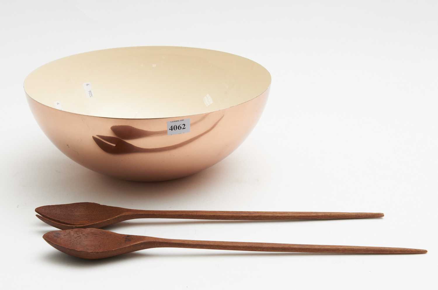 A LARGE CONTEMPORARY ENAMELLED BRASS SALAD BOWL WITH MID-CENTURY DANISH TEAK SALAD SERVERS (30 CM D), LEONARD JOEL LOCAL DELIVERY SIZE: SMALL