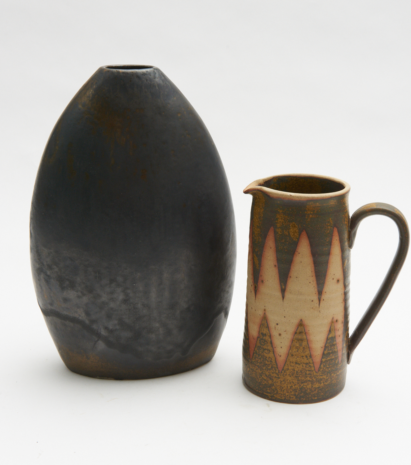 A CERAMIC VASE BY AN UNKNOWN MAKER AND A STONEWARE JUG BY MARTIN GILCHRIST, BEMBRIDGE POTTERY, ISLE OF WIGHT (30 CM H), LEONARD JOEL LOCAL DELIVERY SIZE: SMALL
