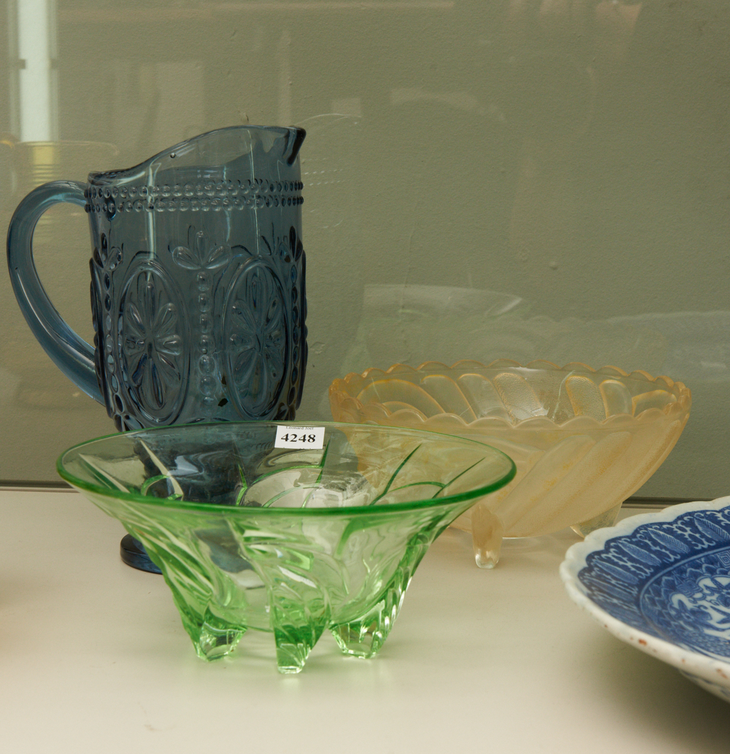 A PRESSED GLASS BLUE JUG AND TWO PRESSED GLASS BOWLS (25 CM H), LEONARD JOEL LOCAL DELIVERY SIZE: SMALL