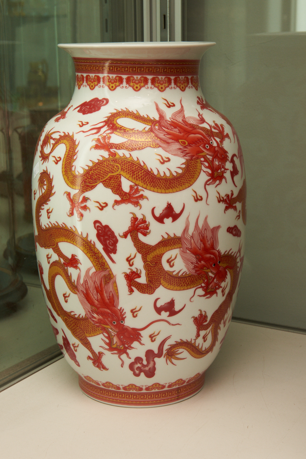 A CHINESE PORCELAIN VASE DECORATED WITH RED AND GOLD DRAGONS, H.41CM, LEONARD JOEL LOCAL DELIVERY SIZE: SMALL