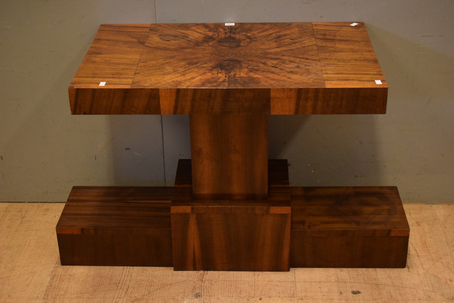 AN UNUSUAL ART DECO BURR WALNUT OCCASIONAL TABLE (A/F) (57H X 92W X 44D CM) (LEONARD JOEL DELIVERY SIZE: MEDIUM)