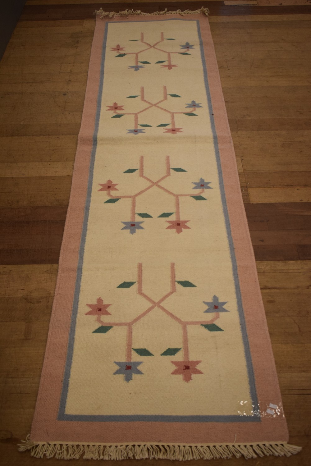 AN INDIAN WOOLLEN DHURRIE RUNNER, 100% HAND WOVEN, COLOURFAST AND REVERSABLE (300 X 80 CM) (LEONARD JOEL DELIVERY SIZE: LARGE)