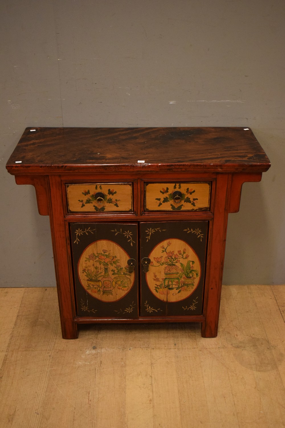 A DECORATIVELY PAINTED TWO DRAWER TWO DOOR CONSOLE (A/F) (87H x 99W x 41D CM) (LEONARD JOEL DELIVERY SIZE: LARGE)