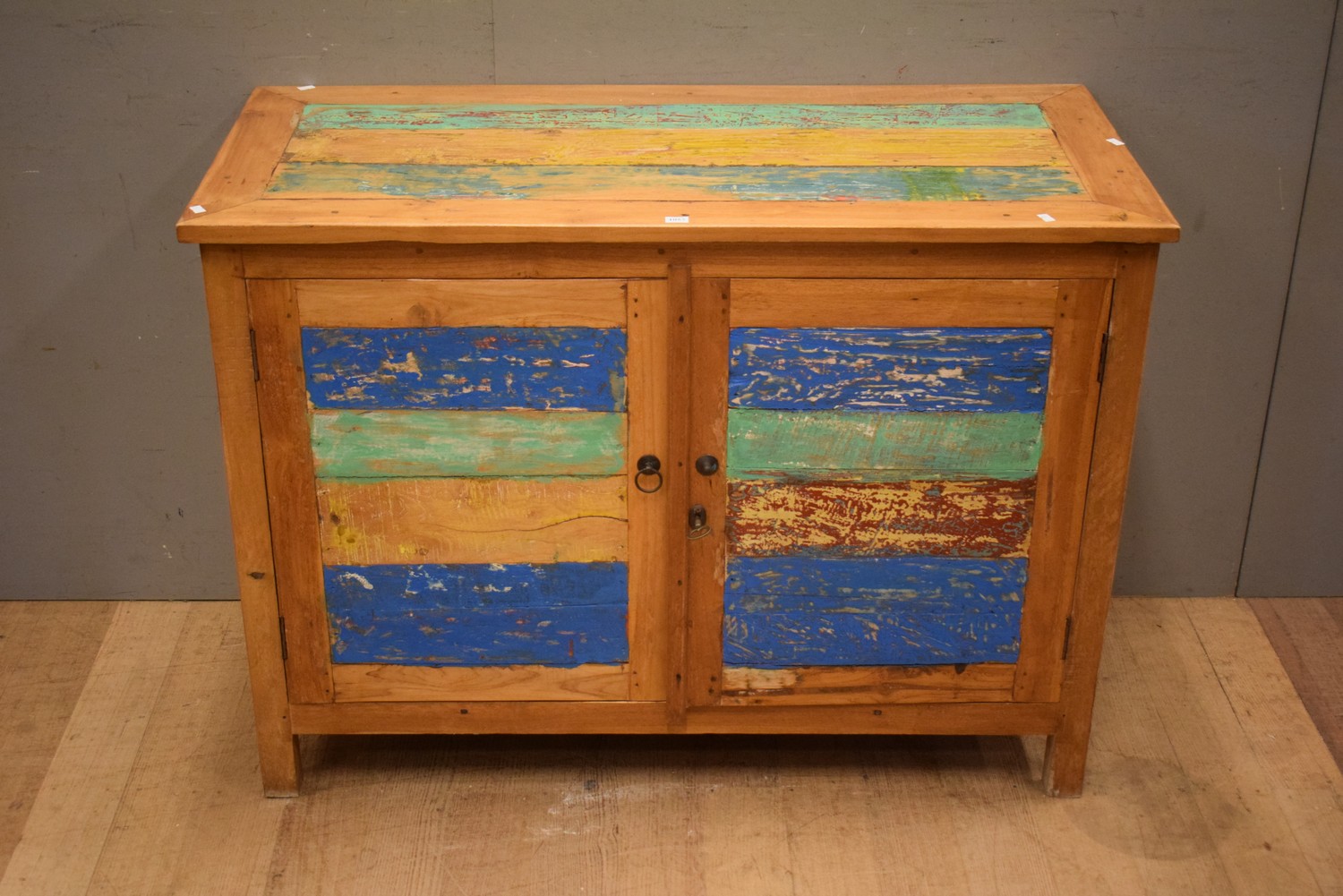 A RUSTIC PAINTED TWO DOOR CABINET (A/F) (80H x 109W x 50D CM) (LEONARD JOEL DELIVERY SIZE: LARGE)
