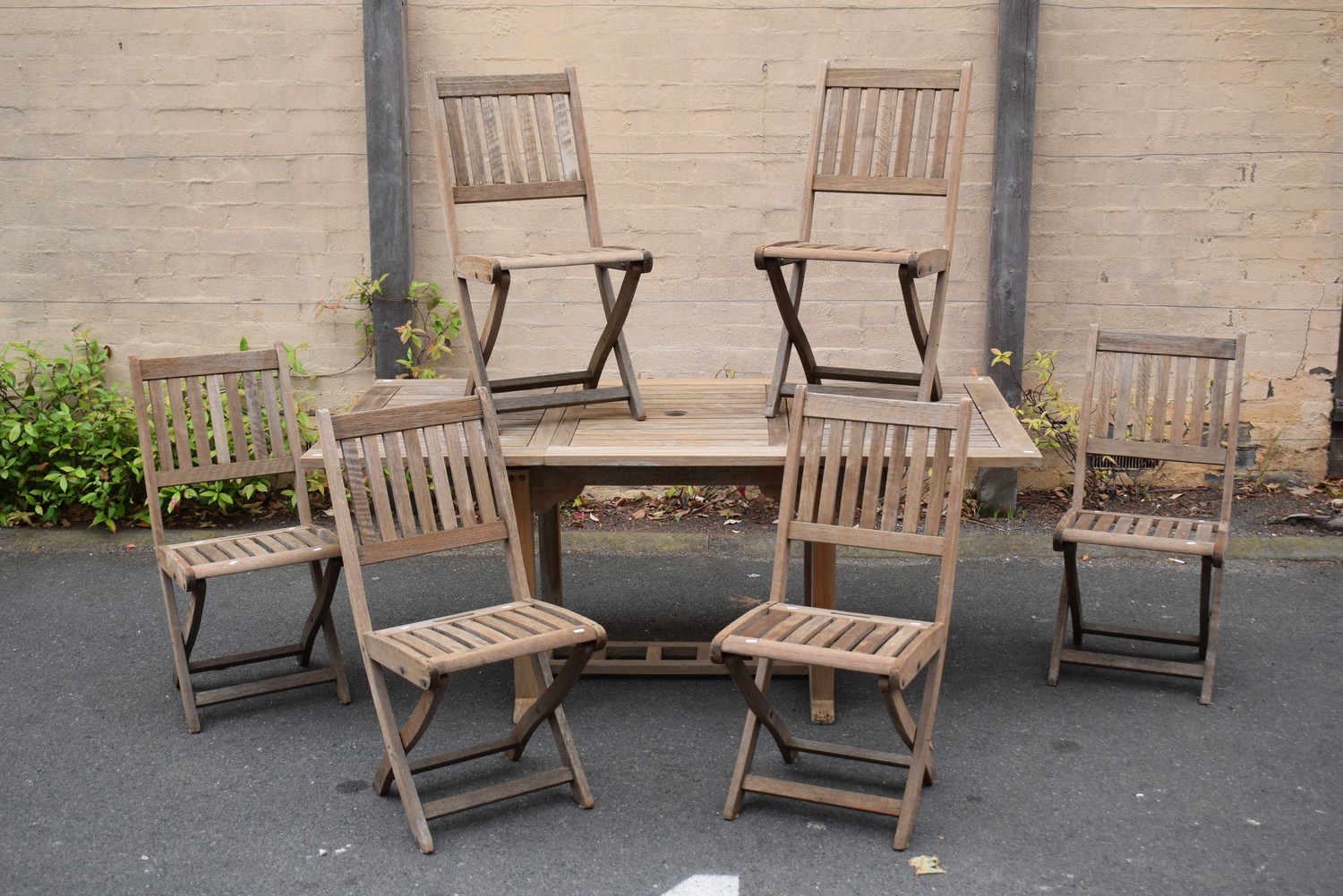 A SEVEN PIECE TEAK OUTDOOR SETTING (A/F) (74H x 181W EXTENDED x 120W UNEXTENDED x 90D CM) (PLEASE NOTE THIS HEAVY ITEM MUST BE REMOVED BY CARRIERS AT THE CUSTOMER'S EXPENSE. LEONARD JOEL STAFF CANNOT ASSIST CARRYING THIS ITEM) (X-LARGE ITEM)