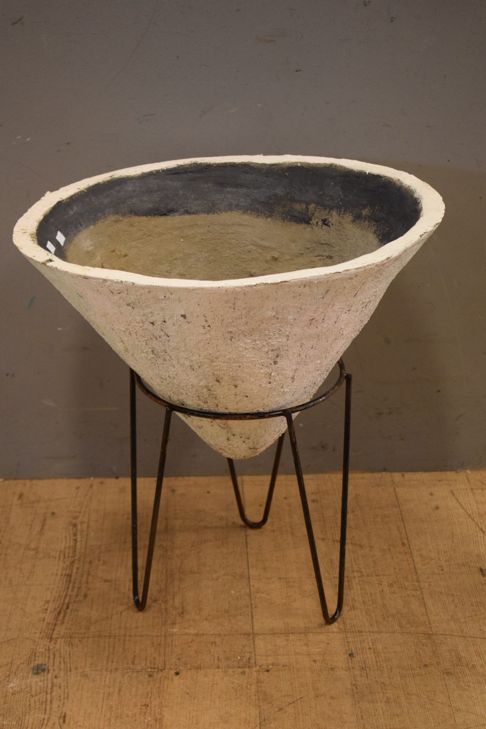 A MID-CENTURY STYLE CONCRETE CONICAL PLANTER ON METAL STAND (49H X 49D CM) (LEONARD JOEL DELIVERY SIZE: LARGE)