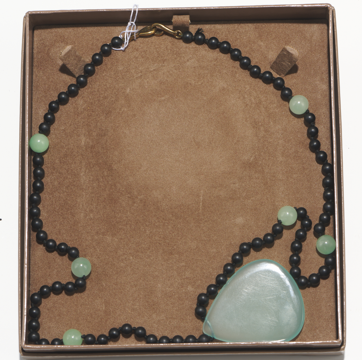 A GREEN TOURMALINE PENDANT IN 18CT WHITE GOLD, THE TOURMALINE ESTIMATED 91.22CTS AND THE DIAMONDS ESTIMATED 0.56CTS,