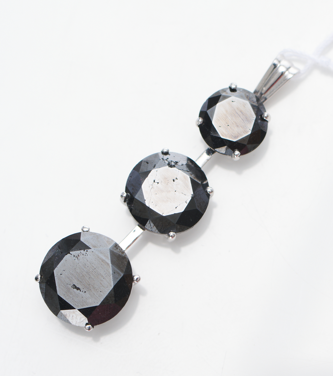 A THREE STONE PENDANT IN 14CT WHITE GOLD, COMPRISING THREE BLACK DIAMONDS ESTIMATED EACH 4.19CTS, 7.20CTS AND 8.40CTS (ONE STONE LOOSE), LENGTH 5CMS