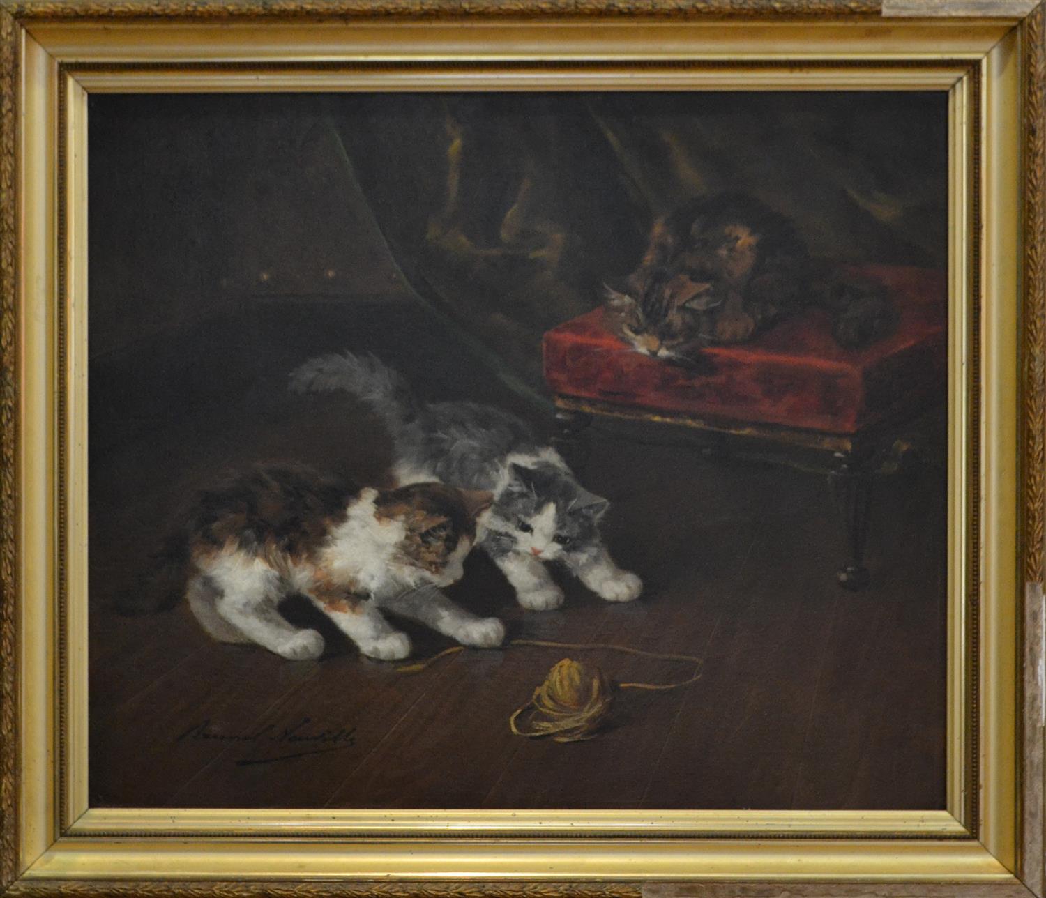 ALFRED ARTHUR BRUNEL DE NEUVILLE, THREE CATS, OIL ON CANVAS, 55 X 63CM. CONDITION: GOOD, CRAZING AND CRACKING EVIDENT ON SURFACE. LEONARD JOEL DELIVERY SIZE: MEDIUM