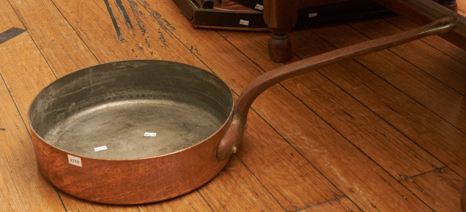 A VERY LARGE FRENCH COPPER FRY PAN DIA.37CM, LEONARD JOEL LOCAL DELIVERY SIZE: MEDIUM