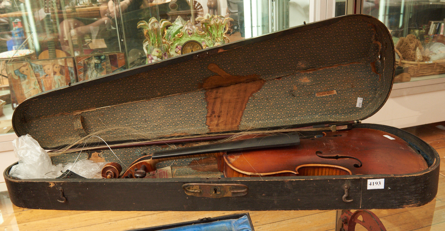 A CASED VIOLIN WITH BOW (A/F), LEONARD JOEL LOCAL DELIVERY SIZE: SMALL
