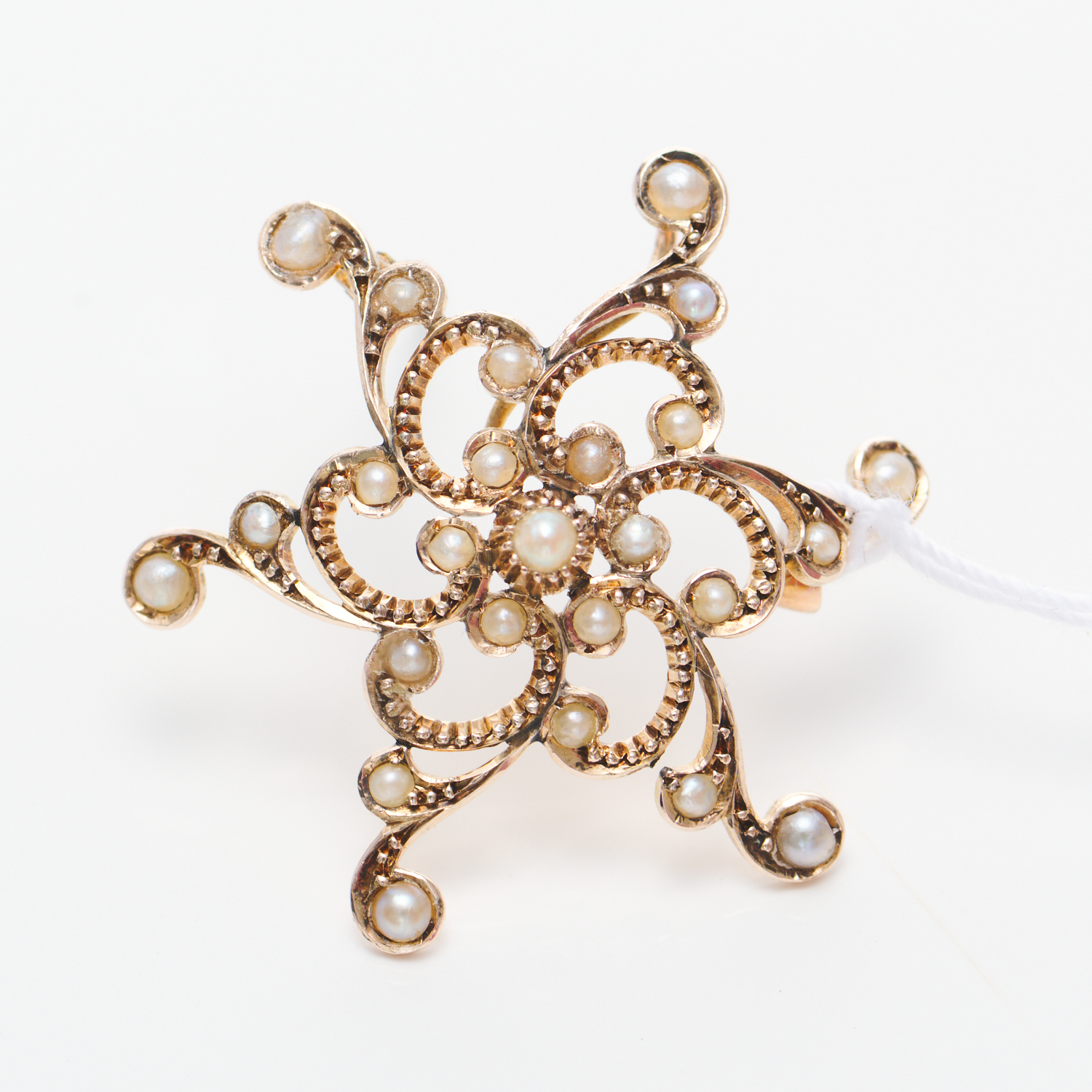 AN ANTIQUE SEED PEARL STAR BROOCH IN 9CT GOLD, CIRCA 1900, LENGTH 30MM, 2.5GMS