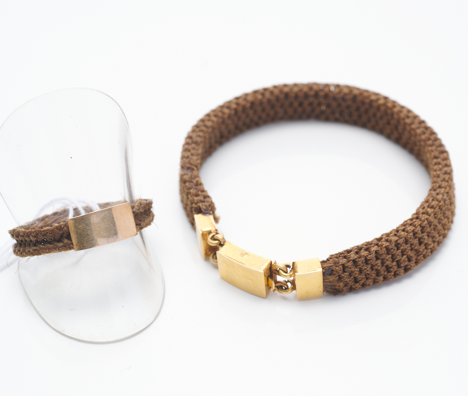 A VICTORIAN HAIR BRACELET AND RING WITH 9CT GOLD FITTINGS, UNSIGNED, LENGTH OF THE BRACELET 15CMS, RING SIZE P