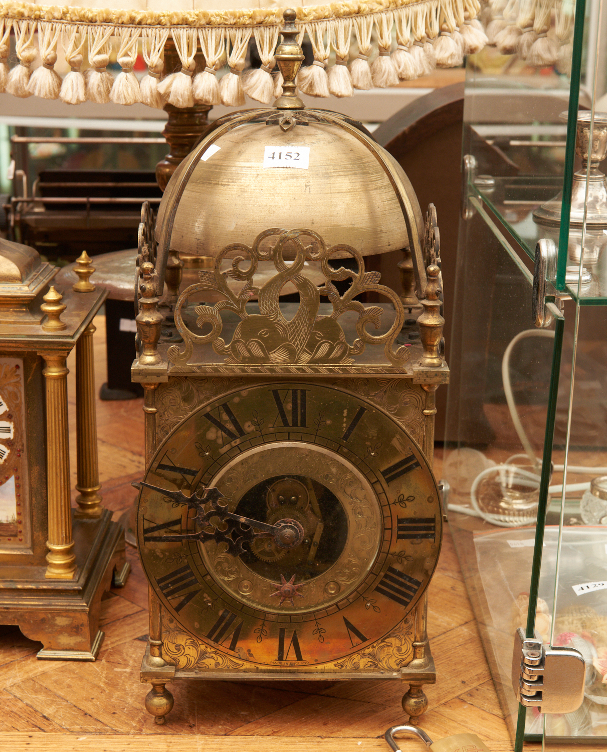 BRASS CASED LANTERN CLOCK, EUREKA MOVEMENT, LONDON H.43CM, LEONARD JOEL LOCAL DELIVERY SIZE: SMALL