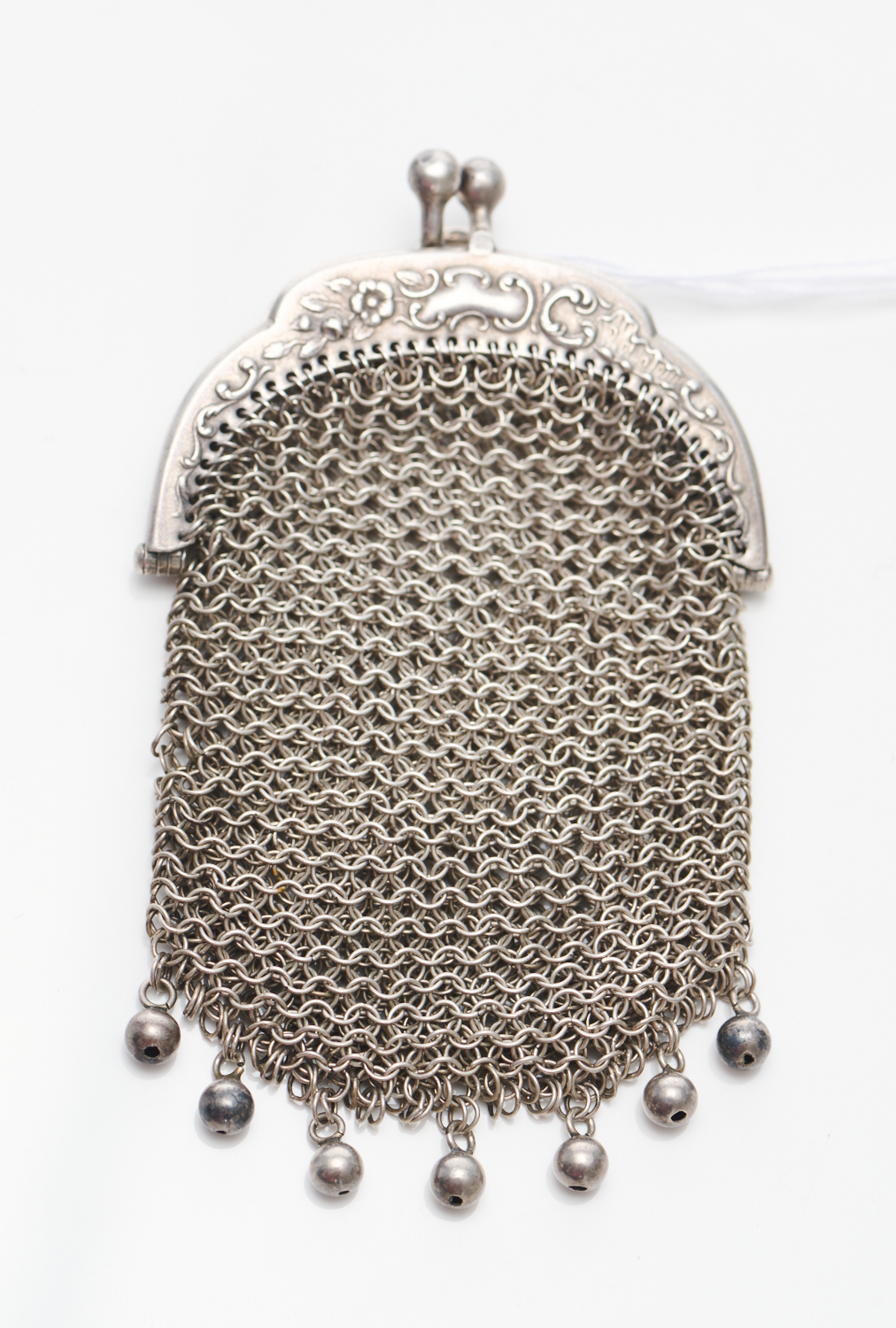 AN ANTIQUE FRENCH MESH COIN PURSE IN SILVER, HALLMARKED, LENGTH 8CMS, 30GMS
