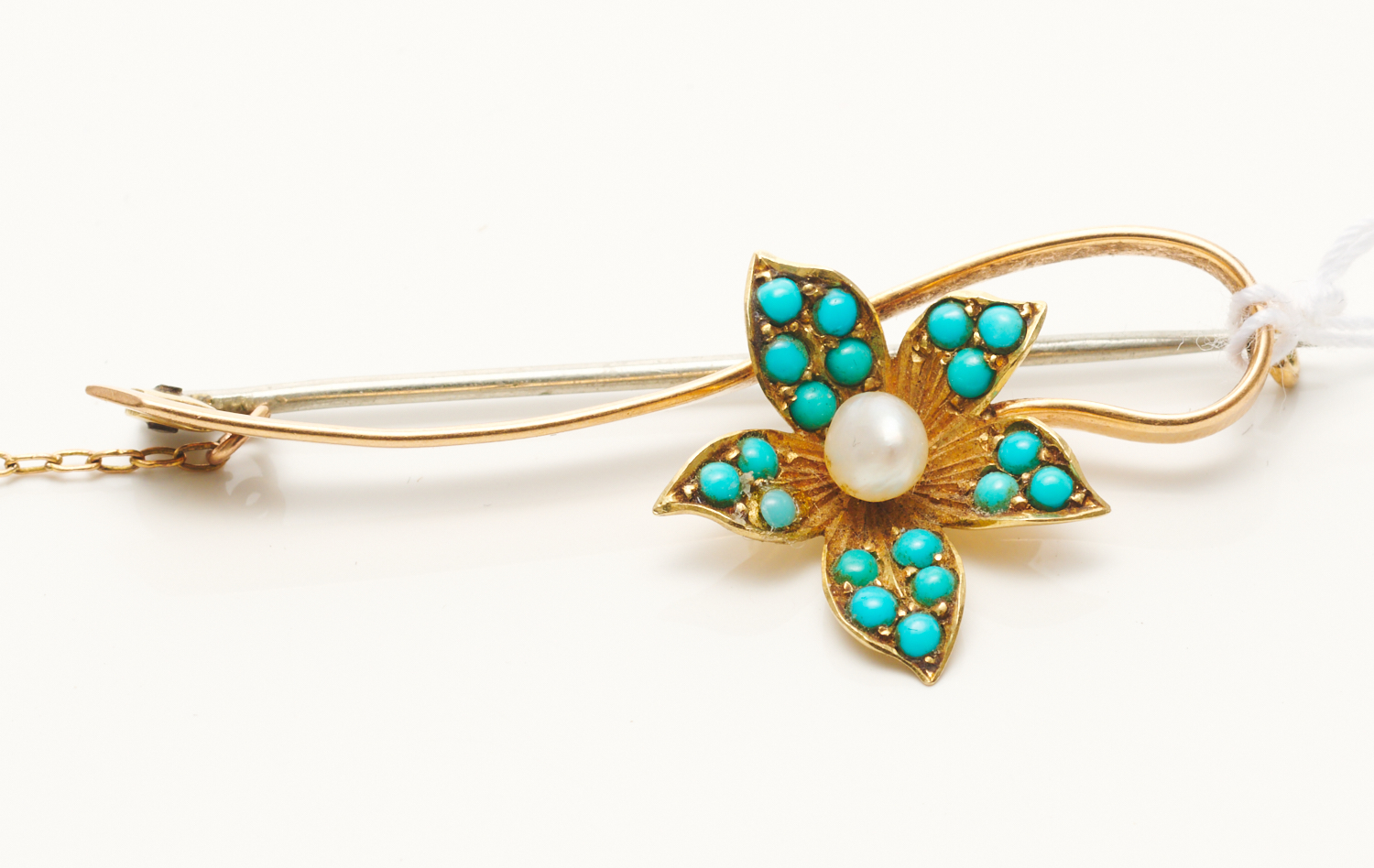 AN AUSTRALIAN TURQUOISE AND PEARL BROOCH IN 15CT GOLD, HALLMARKED, LENGTH 45MM, 4GMS