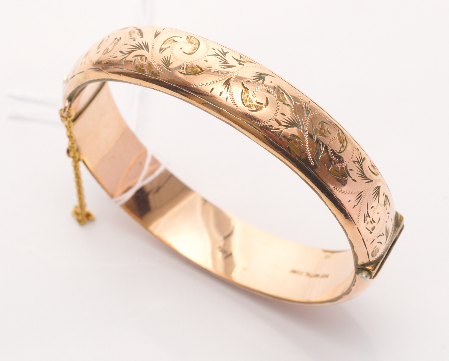 AN ENGRAVED HINGED BANGLE IN 9CT GOLD WITH METAL CORE, INNER DIAMETER 6CMS