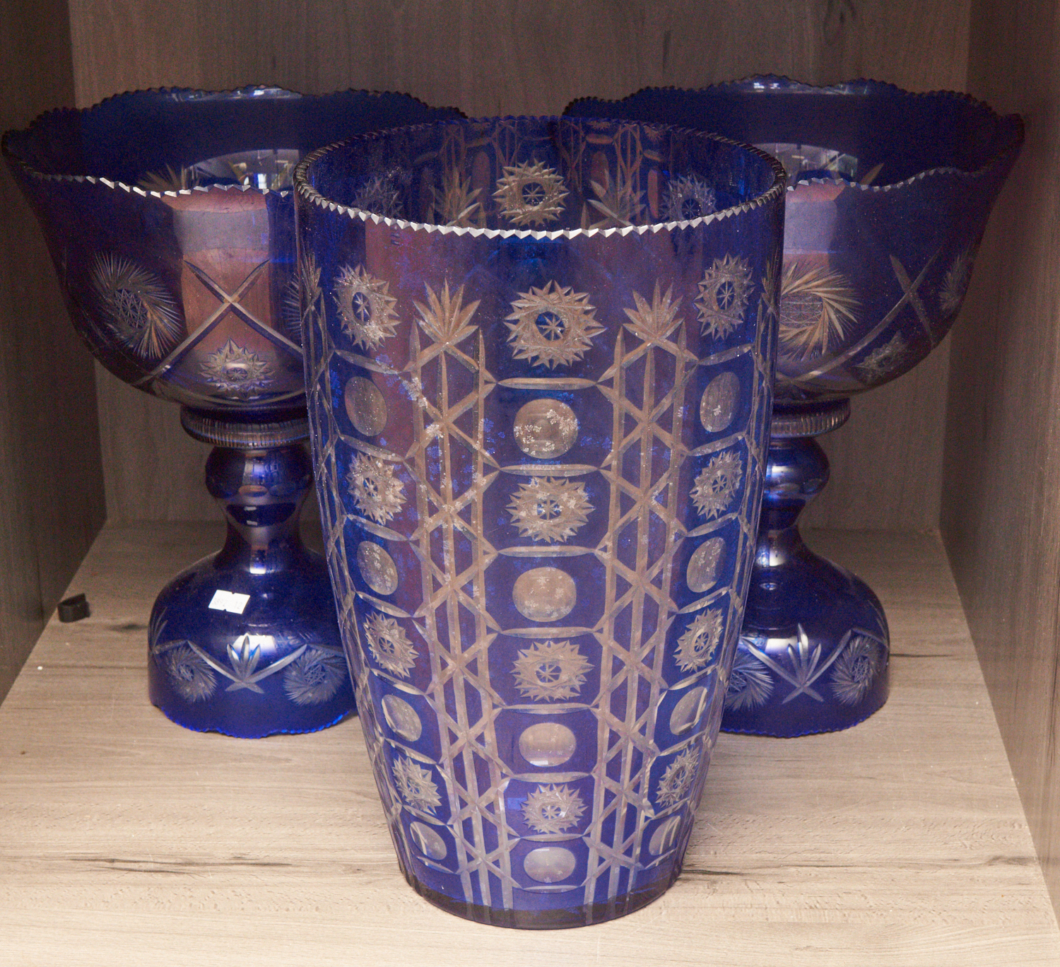 THREE PIECES OF BLUE FLASHED CRYSTAL H.37CM, LEONARD JOEL LOCAL DELIVERY SIZE: SMALL