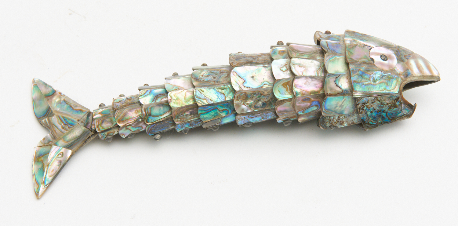 AN ARTICULATED MOTHER OF PEARL FISH W.21CM, LEONARD JOEL LOCAL DELIVERY SIZE: SMALL