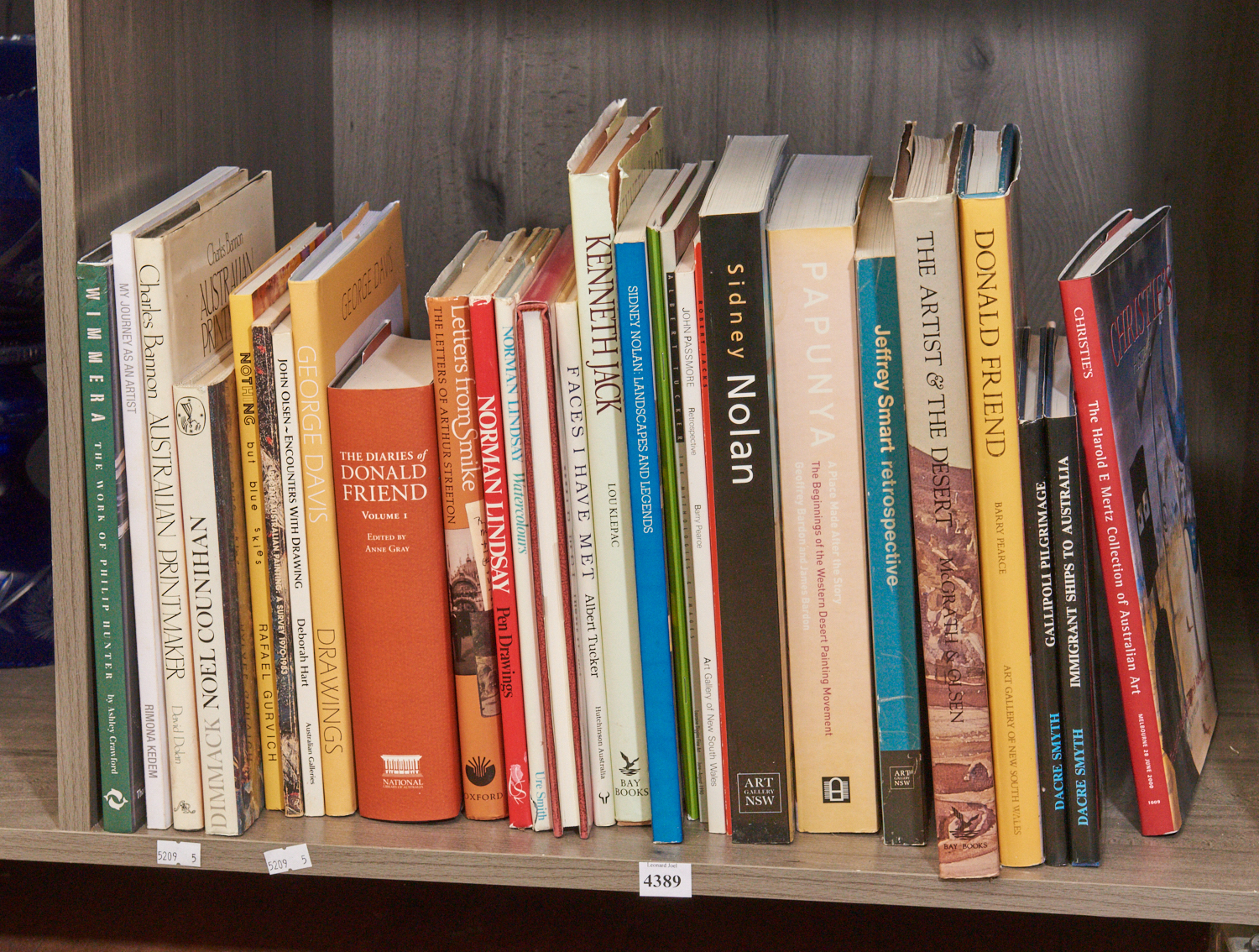A SHELF OF AUSTRALIAN ART REFERENCE INCLUDING PAPUNYA, SIDNEY NOLAN AND SIGNED KENNETH JACK, LEONARD JOEL LOCAL DELIVERY SIZE: SMALL