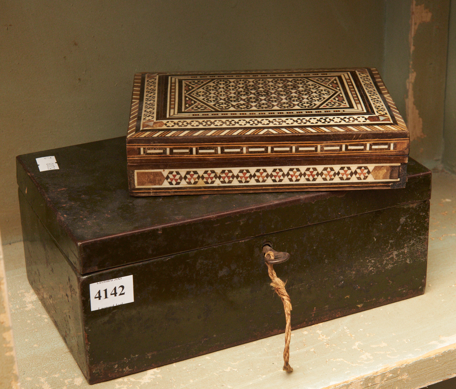 A VINTAGE CASH TIN TOGETHER WITH INLAID BOX, LEONARD JOEL LOCAL DELIVERY SIZE: SMALL