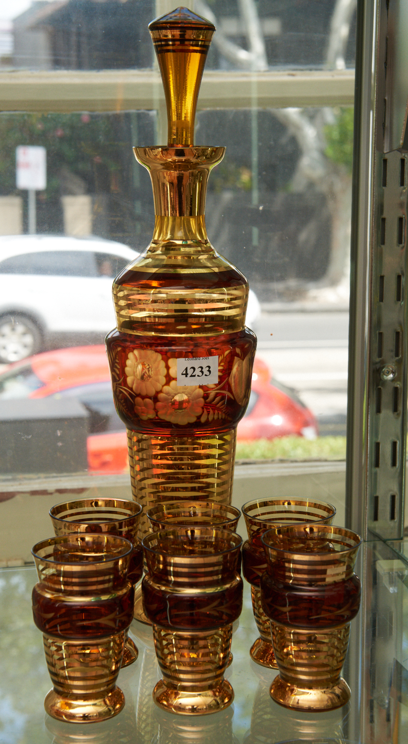 A BOHEMIAN FLASHED AND ETCHED GLASS DECANTER AND SIX GLASSES, LEONARD JOEL LOCAL DELIVERY SIZE: SMALL