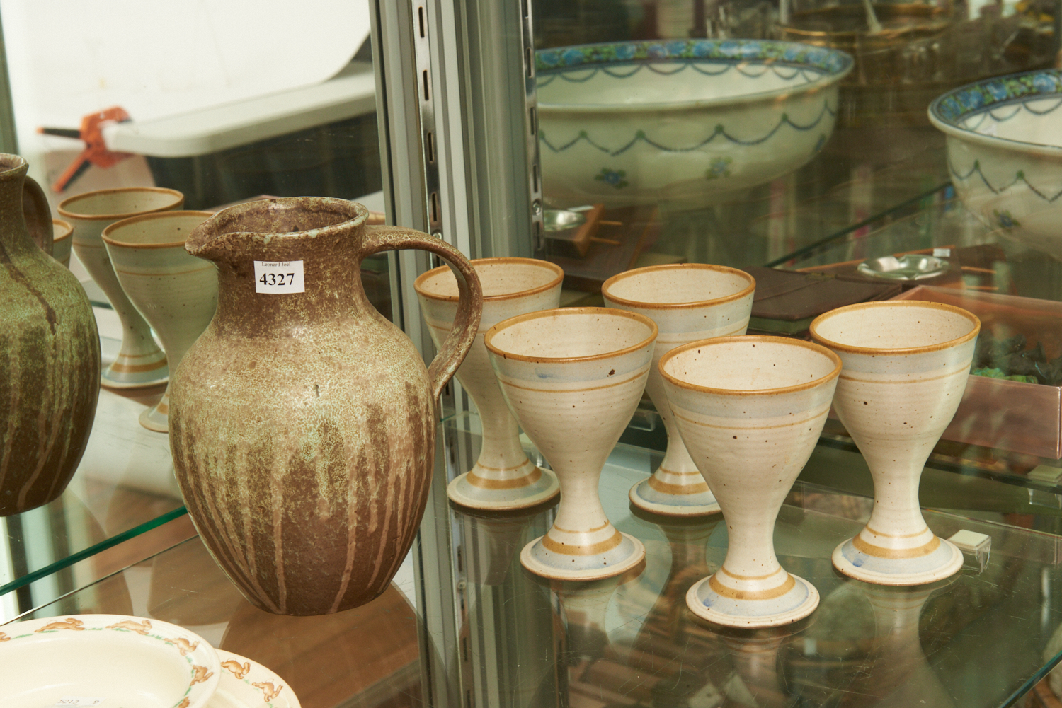 FIVE BLUE AND WHITE CERAMIC GOBLETS SIGNED AB AND A JUG SIGNED CHRIS SANDERS '74, LEONARD JOEL LOCAL DELIVERY SIZE: SMALL