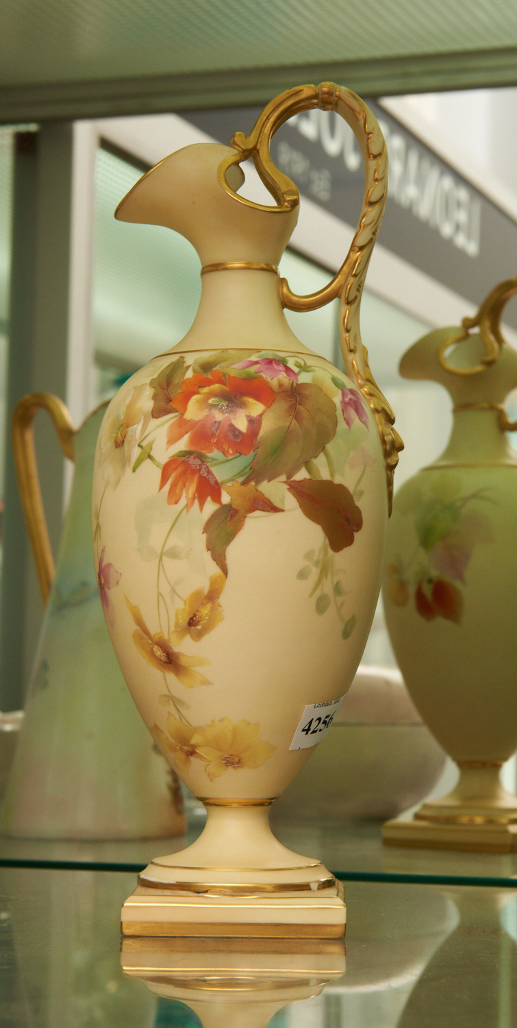 A GRAINGER & CO WORCESTER EWER, DECORATED SUMMER FLOWERS TO AN IVORY GROUND AND HIGHLIGHTED IN GILT (BASE REPAIR) H.21CM, LEONARD JOEL LOCAL DELIVERY SIZE: SMALL