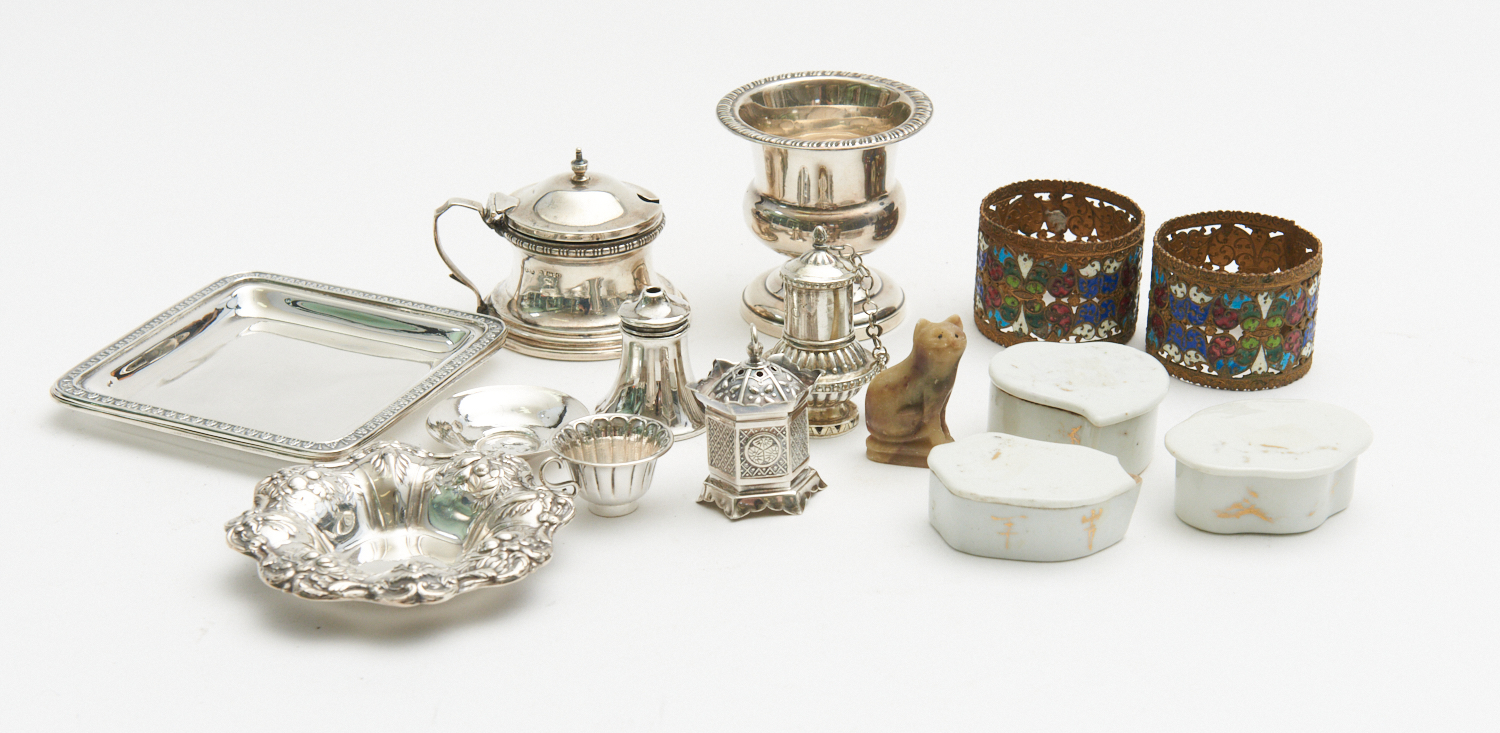 A COLLECTION OF MINIATURE SILVER ITEMS, TWO ENAMELLED NAPKIN RINGS, A SOAPSTONE CARVING, AND CHINESE PASTE BOXES, LEONARD JOEL LOCAL DELIVERY SIZE: SMALL