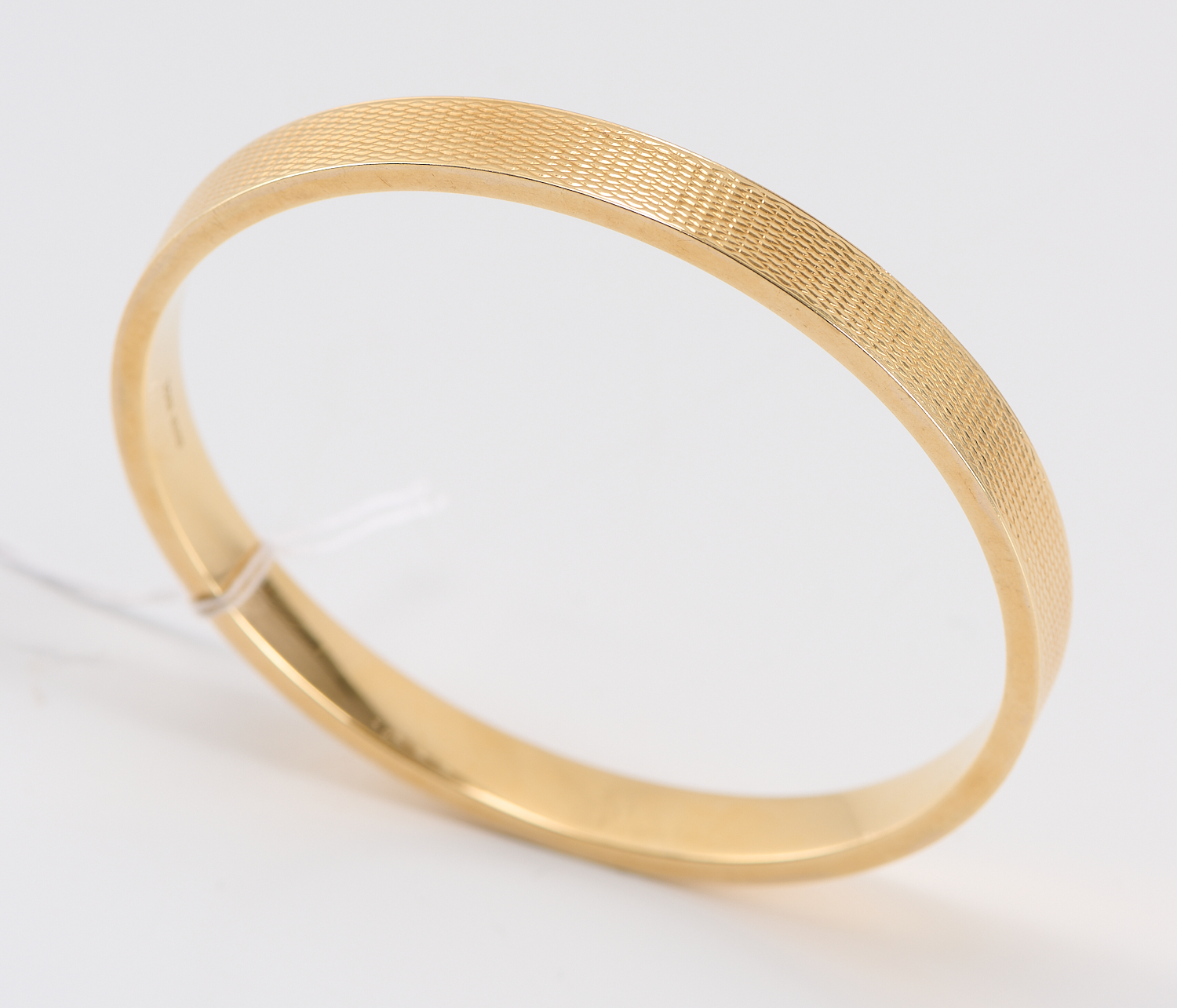 The 7mm wide hollow flat band is continuously decorated in an engine-turned pattern, inner circumference approximately 235mm, maker's marks H.C & S, 21.9gms