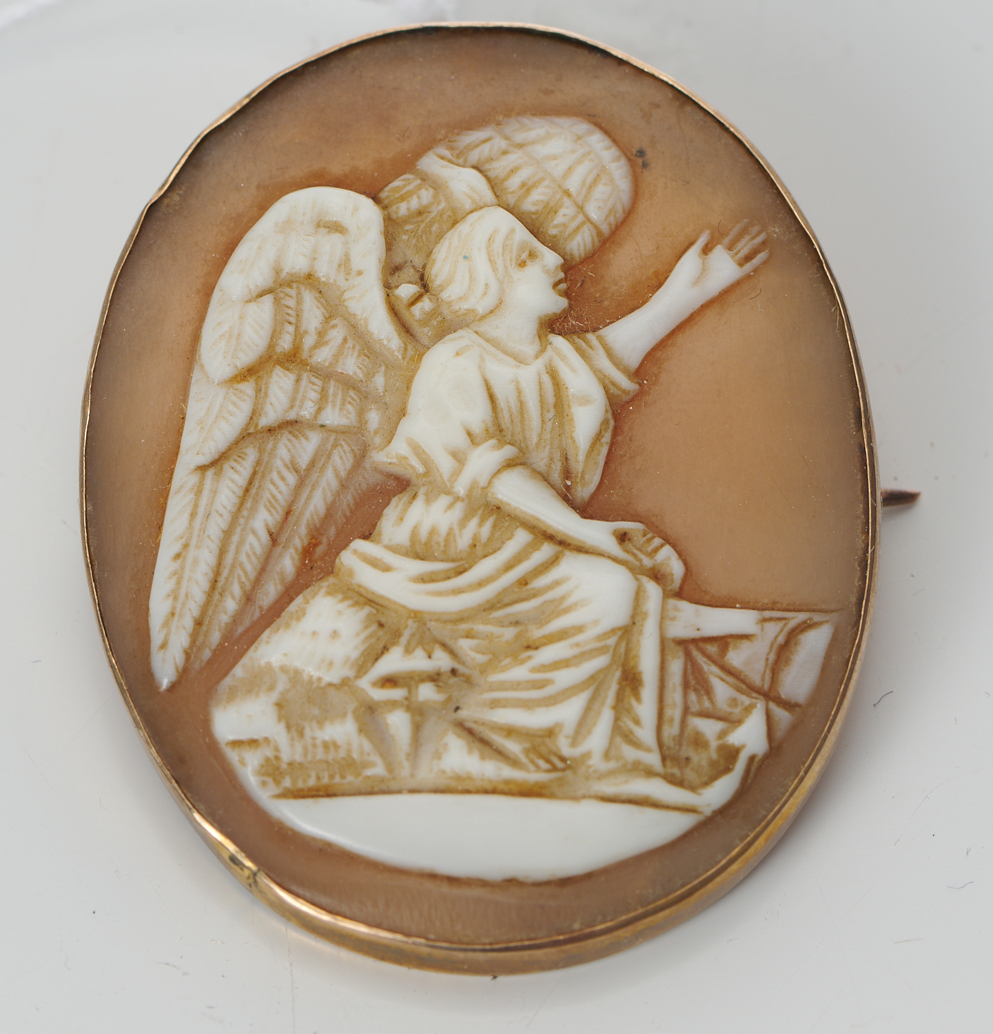 AN ANTIQUE CAMEO BROOCH/PENDANT IN LOW CARAT GOLD, DEPICTING THE ANGEL GABRIEL, LENGTH 40MM