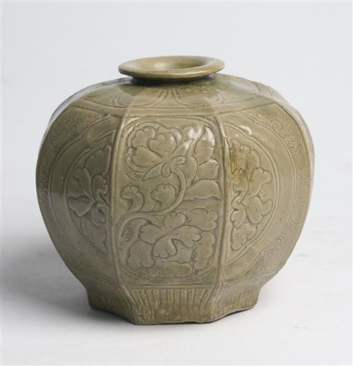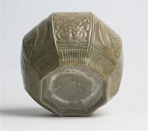 The octagonal section jar decorated with shaped reserves containing sprays of peony blossom and foliage, surrounded by incised scrolling foliage, with incised lotus petal design around the neck. The whole covered in a olive-grey-green coloured glaze. Pontil marks to the base from the firing.
