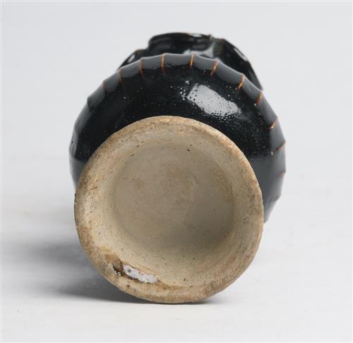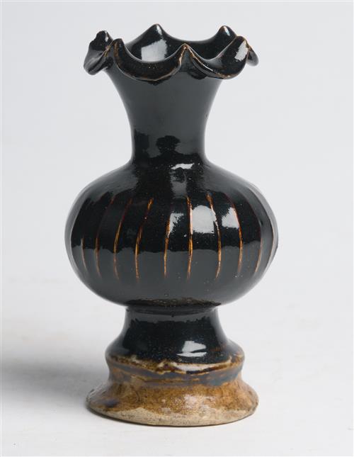 Of baluster form with vertical ribs to the body, and a ruffled mouth rim, the whole covered in a rich black-brown glaze, thinning to reveal the paler buff coloured body beneath at the ribs.