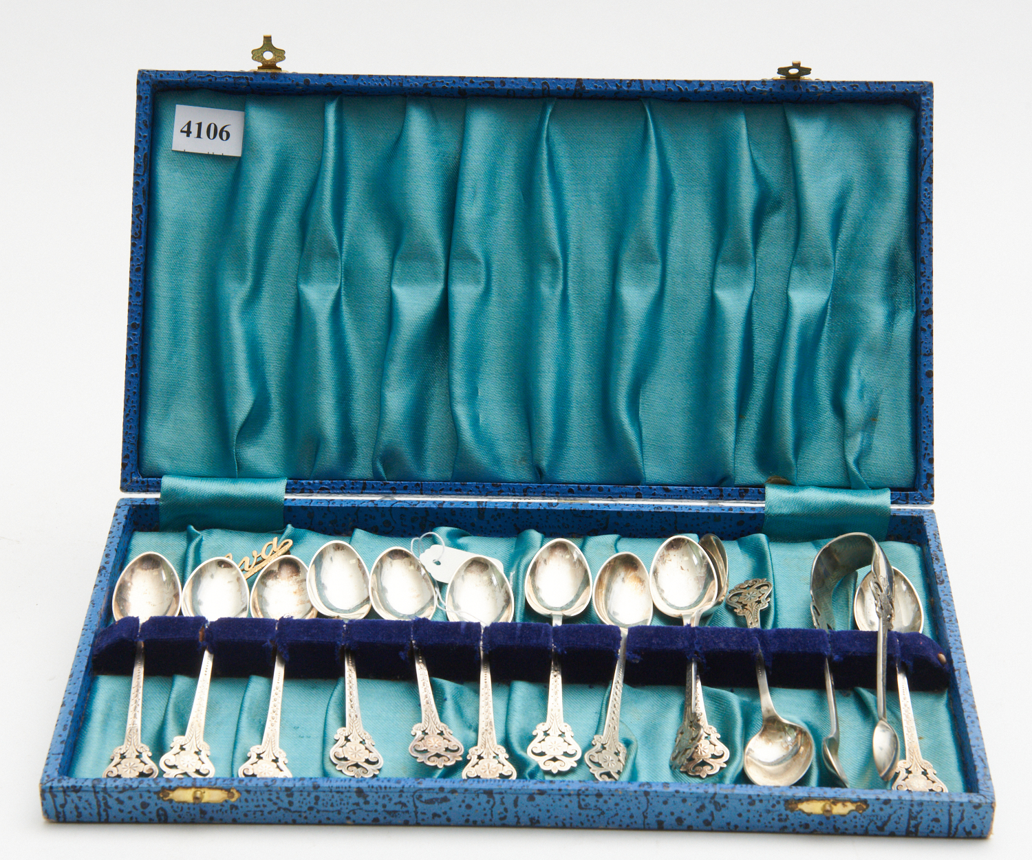 A CASED SET OF SILVER SPOONS TOGETHER WITH SUGAR TONGS, LEONARD JOEL LOCAL DELIVERY SIZE: SMALL