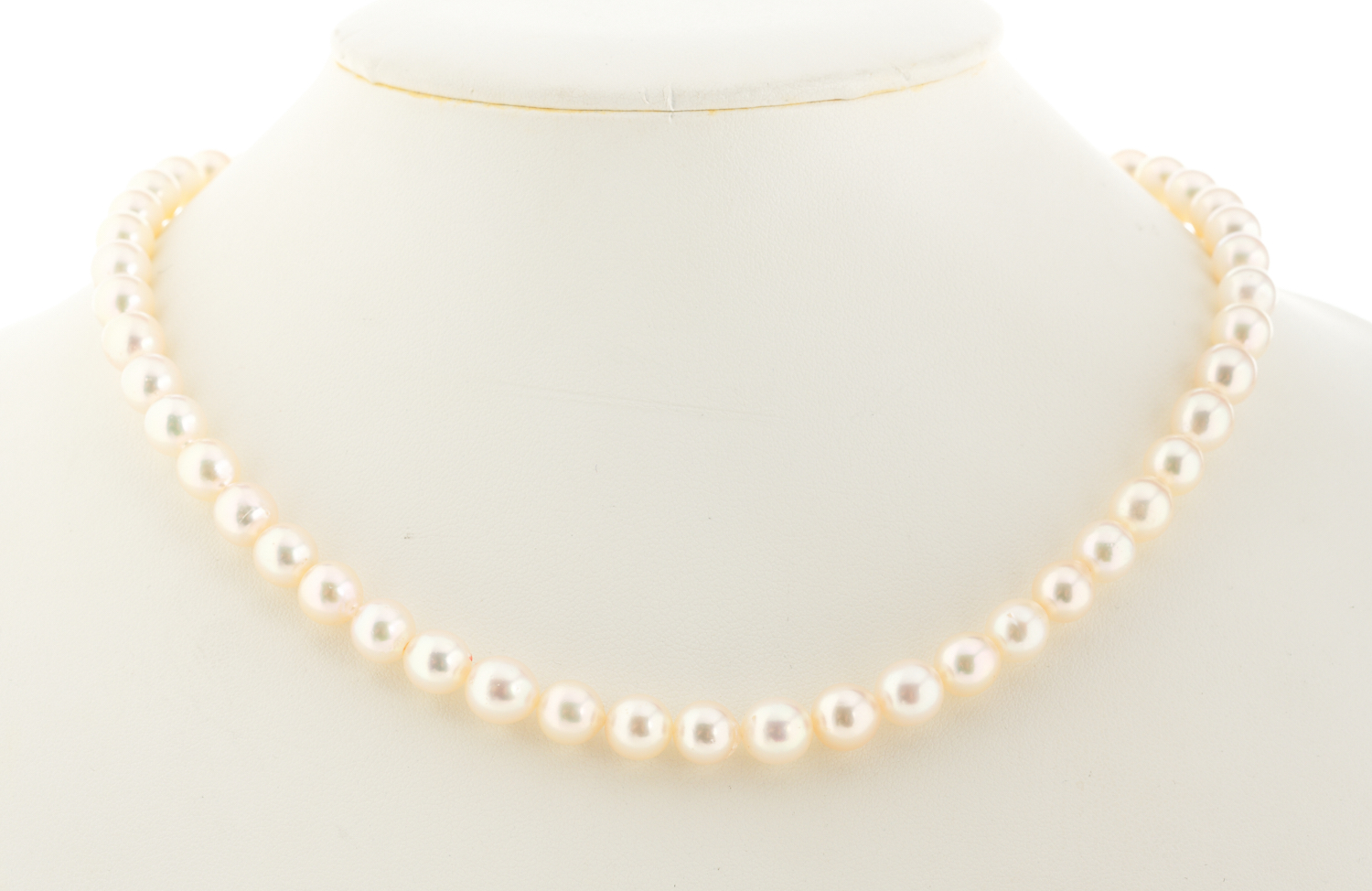 A STRAND OF CULTURED PEARLS MEASURING 7-8MM, TO A GOLD PLATED MAGNETIC CLASP, TOTAL LENGTH 44CM