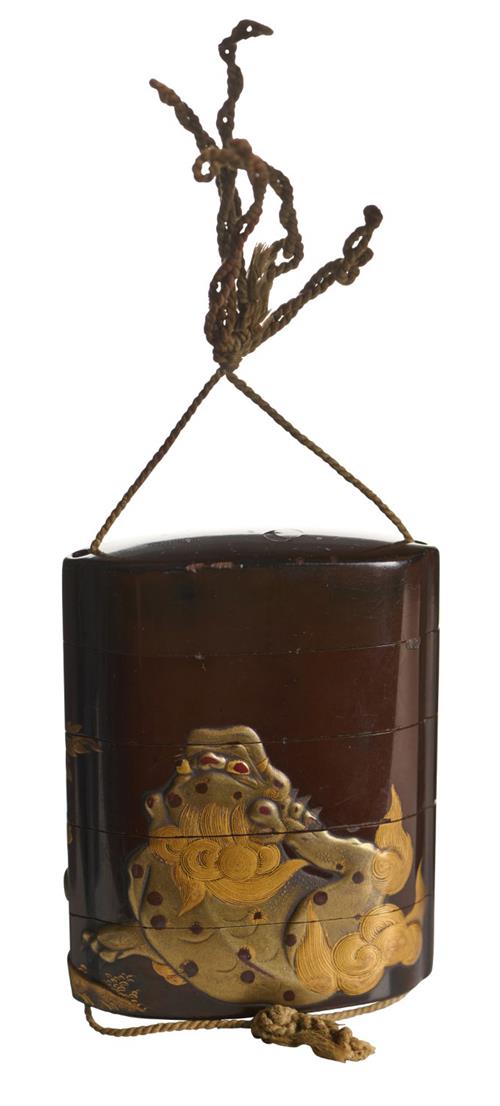 A four case inro on a brown ground decorated with peonies in mother of pearl, and hiramakie and takamakie, the reverse featuring a Shishi (foo dog) ready to leap, also decorated in fine takamakie (high relief) lacquer. The internal decorated in traditonal nashi-ji (pear skin) application.